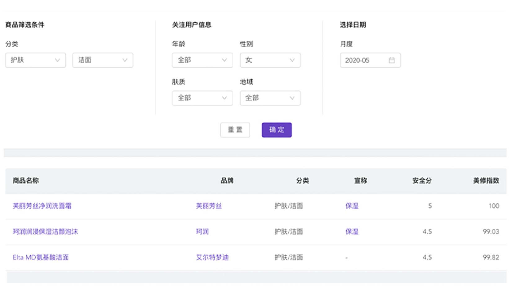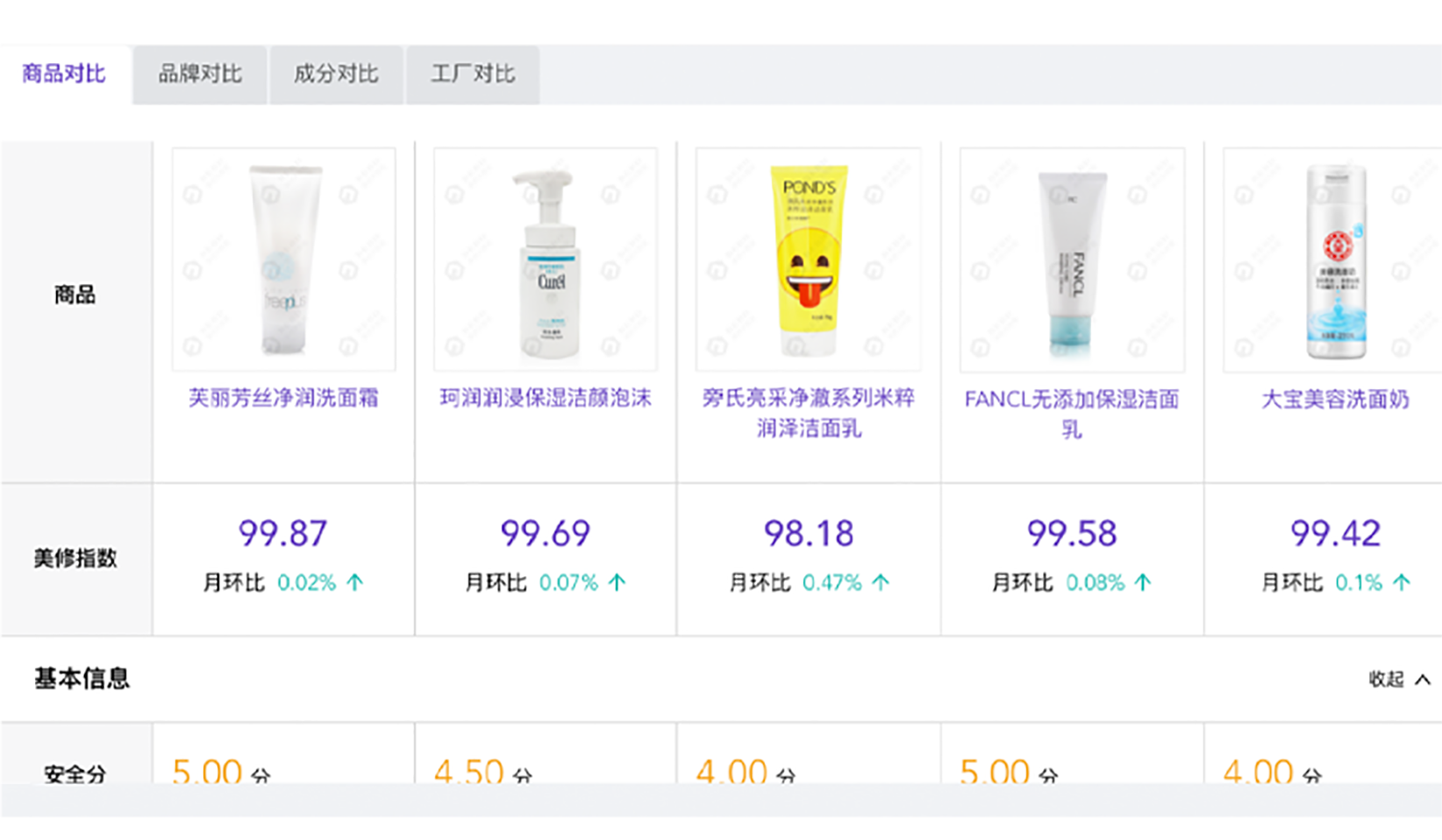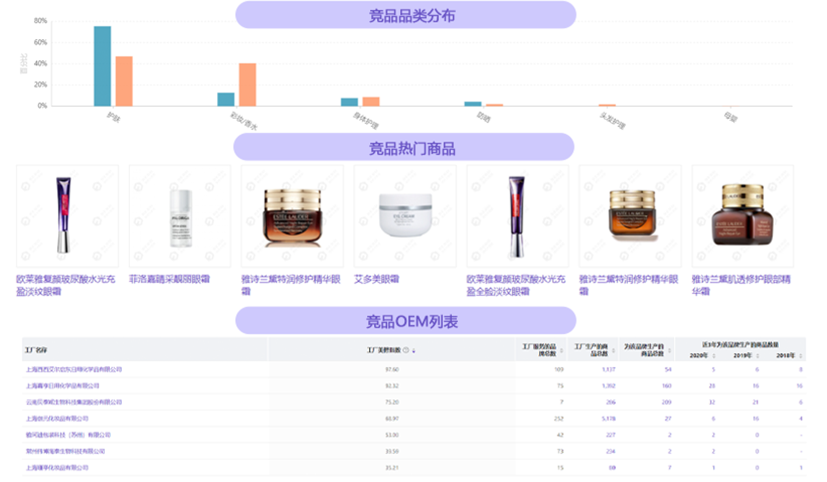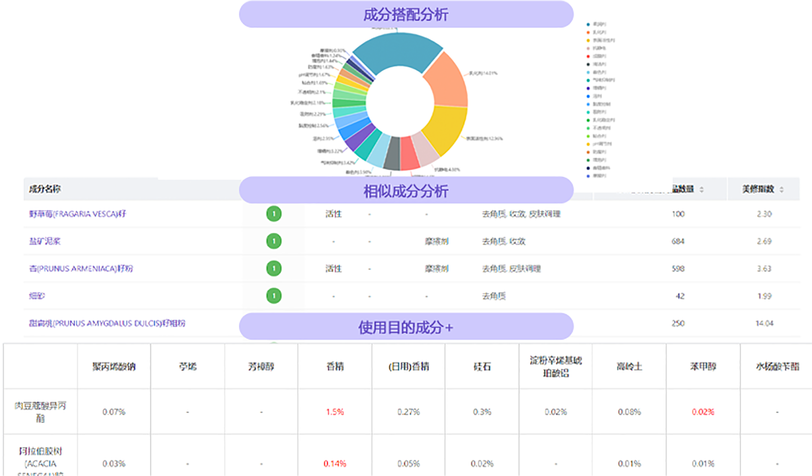 研究对标产品,从宣称、价格、容量、成分表等详细信息的对比,以及成分搭配分析为新品研发提供方向参考和决策依据